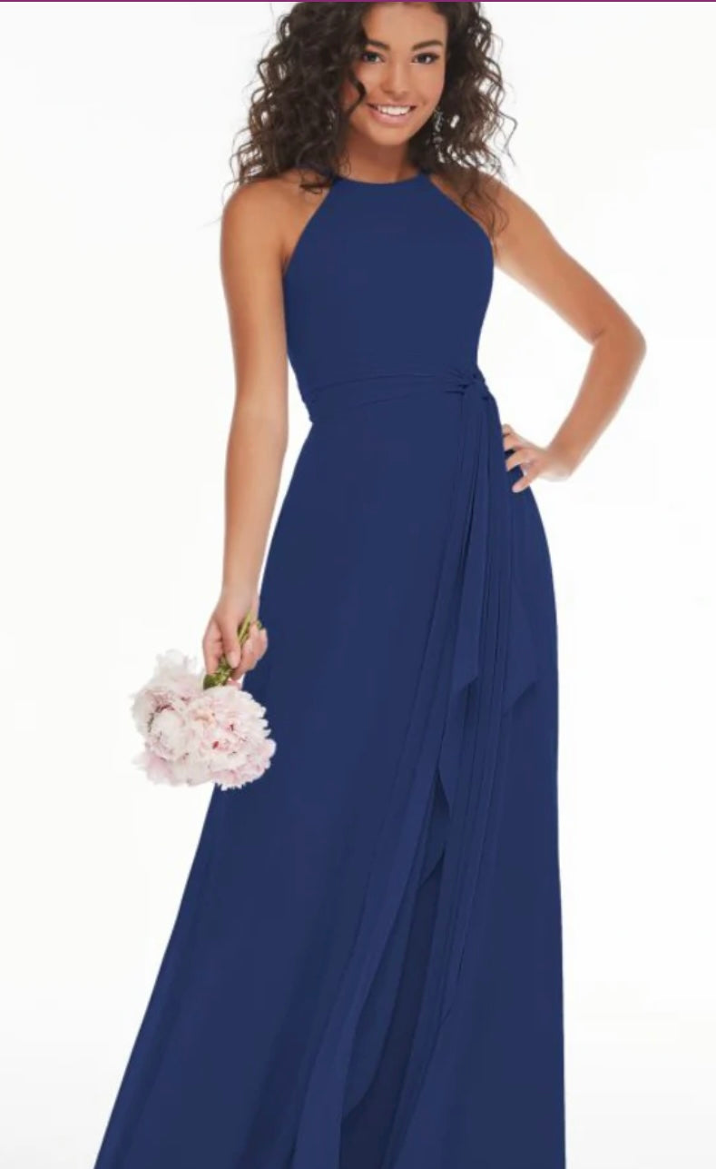 This halter neckline gown features a double spaghetti strap detail and natural waist placement. There is a self-tie at the waist that adds a romantic touch. The skirt is a full A-line.