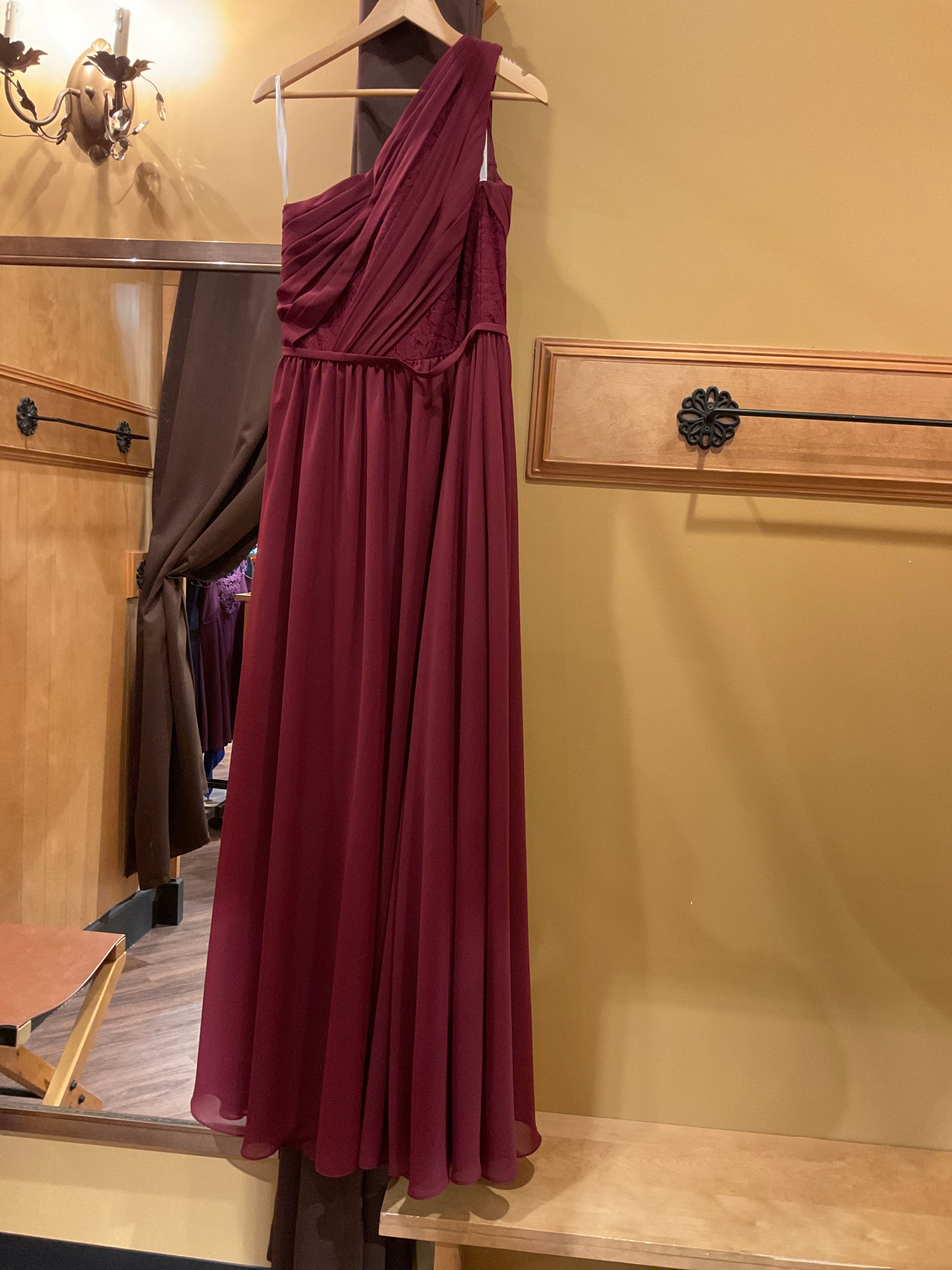 A chiffon and lace a-line dress with a single shoulder strap. The dress seizes attention to its alternating stripes of bodice fabric. Has a sewn in chiffon belt and side zipper.